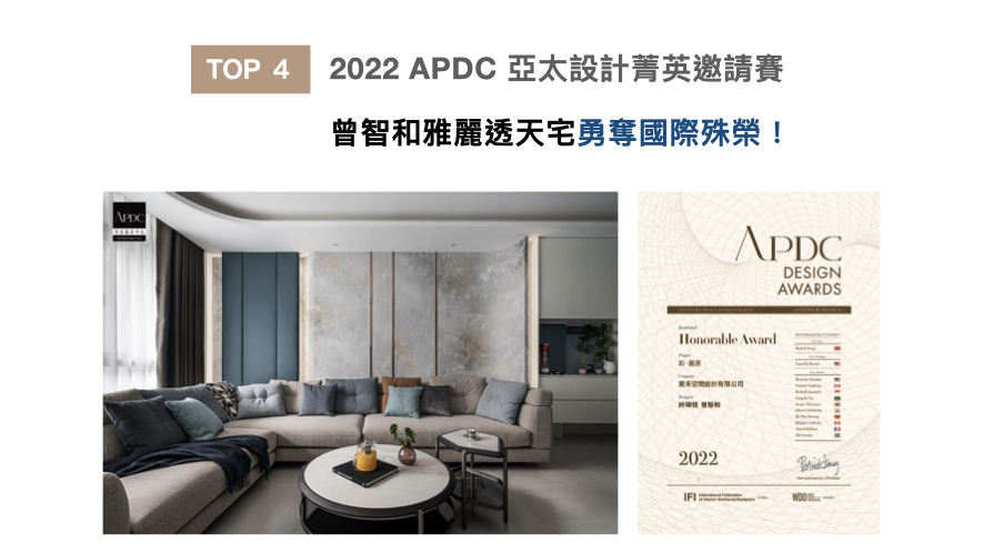 APDC 亞太設計中心的核心會員由全球優秀建築師、室內設計師、產品設計師構成,不斷地促進中外設計深入的交流和互動,並將APDC 設計大獎推向新的巔峰。曾總監 以木、石的細緻紋理堆疊畫面層次,佐搭藝術塗料的斑駁質感,豐富而細膩的作品《彩・藝居》深受評審團一致肯定,喜獲「Honorable Award」榮譽!